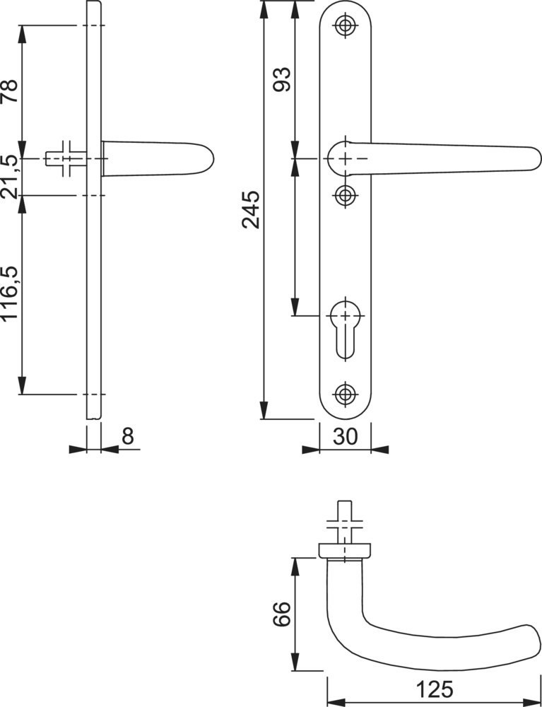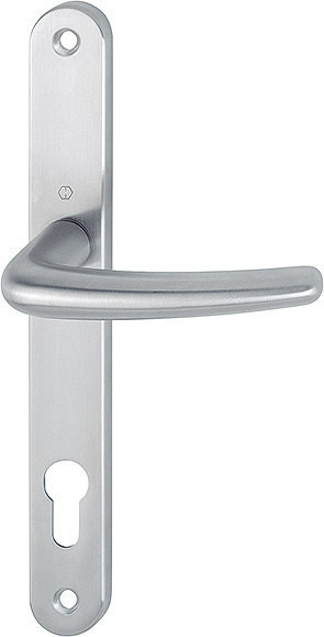 Halbgarnitur, Innenseite / F69 Edelstahl matt / 8 mm / 40 mm vorst. / Profilzylinder 92 mm / HOPPE-Logo / 3 Nocken M6 Kunststoff / 78 mm Mitte obere Nocke/Mitte Griffloch