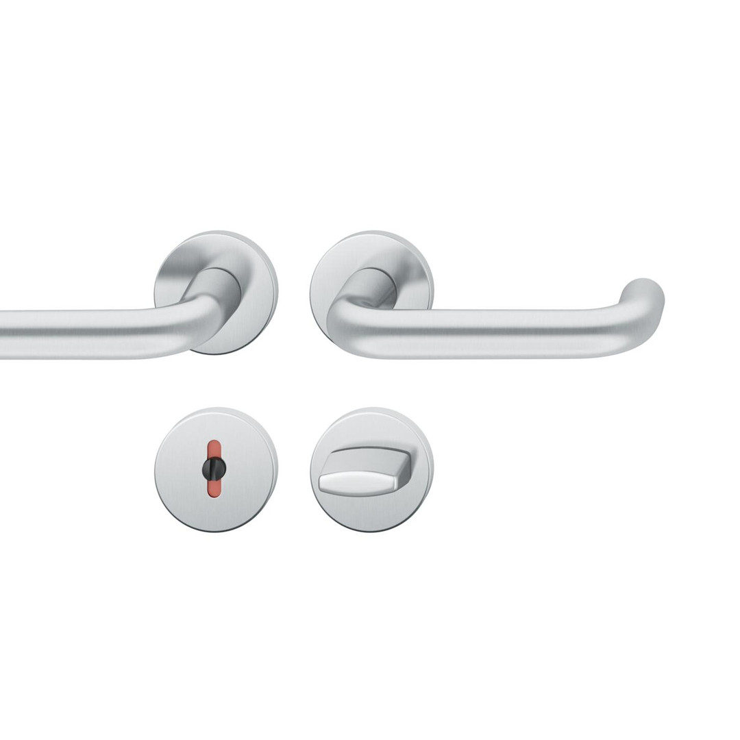 Türdrückergarnitur 1070 mit runden Rosetten 1731/1735, mit festdrehbarer Gleitlagerung in Adaptertechnik, richtungsneutrale Hochhaltefeder und Unterkonstruktion in glasfaserverstärktem Kunststoff mit Edelstahlverstärkung, Verschraubung mit M5 Durchgangss