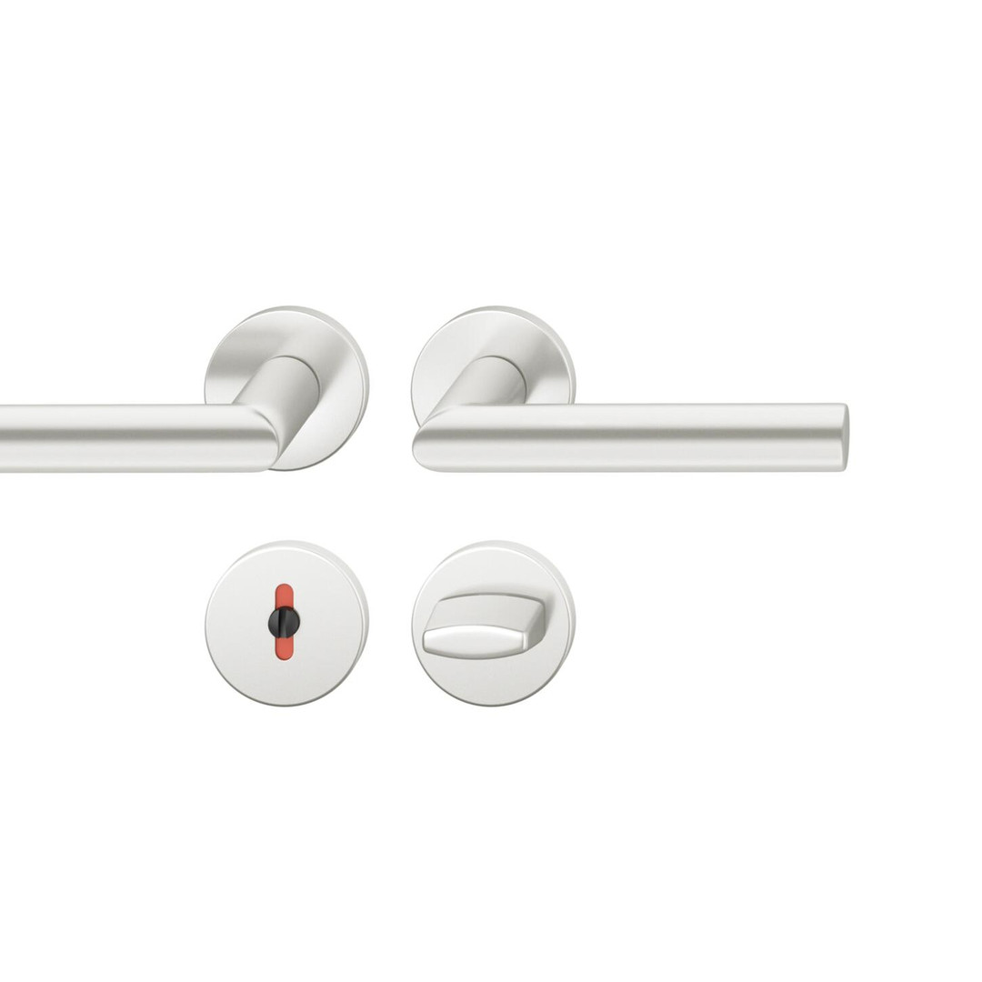 Türdrückergarnitur 1076 mit runden Rosetten 1731/1735, mit festdrehbarer Gleitlagerung in Adaptertechnik, richtungsneutrale Hochhaltefeder und Unterkonstruktion in glasfaserverstärktem Kunststoff mit Edelstahlverstärkung, Verschraubung mit M5 Durchgangss