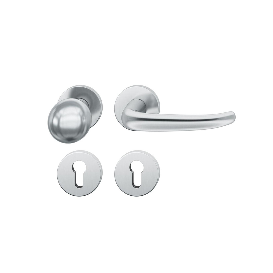 Türdrückergarnitur 1023 mit runden Rosetten 1731/1735, mit festdrehbarer Gleitlagerung in Adaptertechnik, richtungsneutrale Hochhaltefeder und Unterkonstruktion in glasfaserverstärktem Kunststoff mit Edelstahlverstärkung, Verschraubung mit M5 Durchgangss