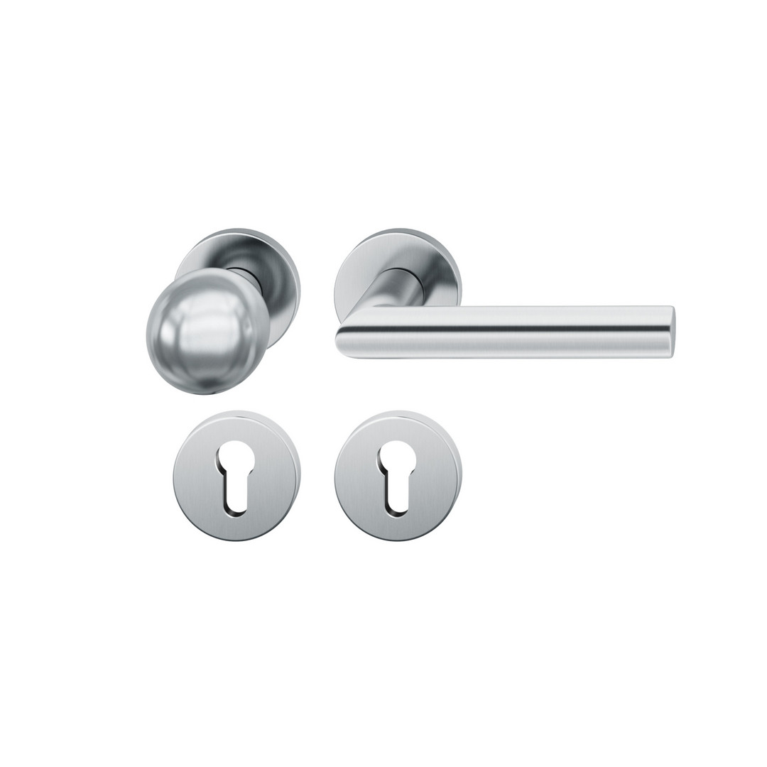 Türdrückergarnitur 1076 mit runden Rosetten 1731/1735, mit festdrehbarer Gleitlagerung in Adaptertechnik, richtungsneutrale Hochhaltefeder und Unterkonstruktion in glasfaserverstärktem Kunststoff mit Edelstahlverstärkung, Verschraubung mit M5 Durchgangss