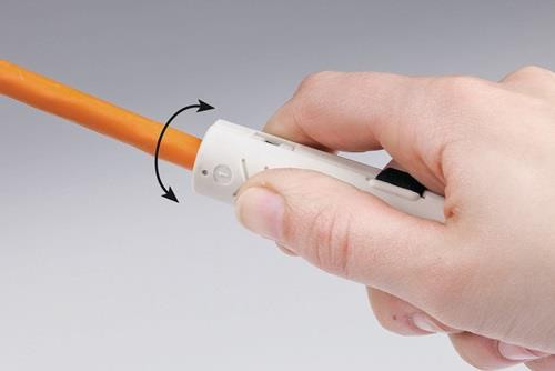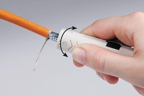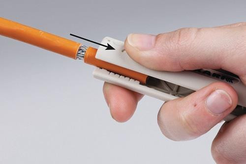 zum Abmanteln PVC-isolierte Datenkabel · Klingen Titan-Nitrid beschichtet, dadurch höhere Schnittgeschwindigkeit, geringerer Verschleiß, höhere Standzeit · mit Längenskala · 2 Klingenpaare für Außenmantel und Folienabschirmung Weitere technische Eigenschaften: · Gewicht: 22g