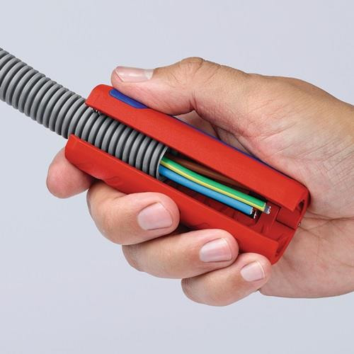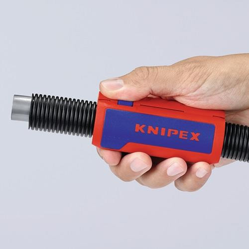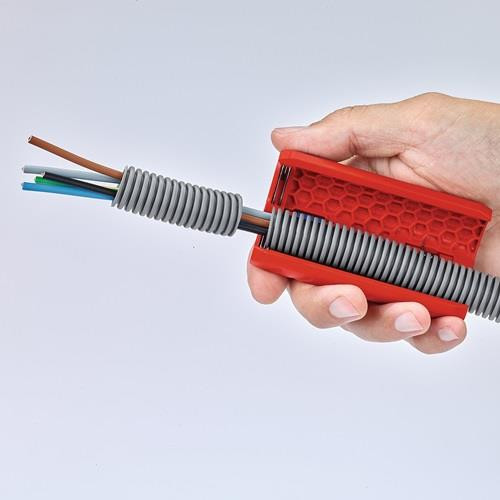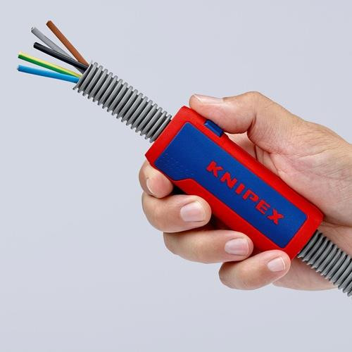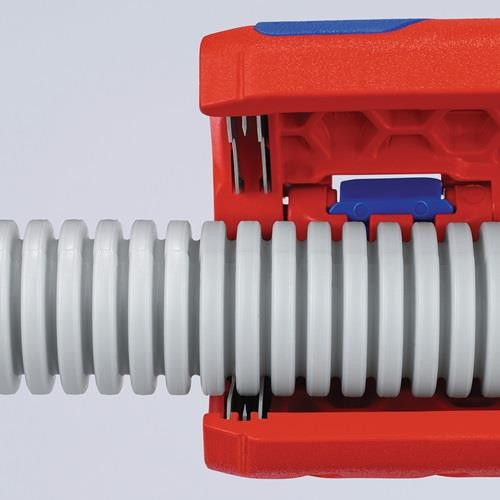 Wellrohrschneider · zum Ablängen von leeren oder fertig konfektionierten Wellrohren · doppelseitige Führung für präzisen Schnitt · Gehäuse aus stabilem Polyamid-Compound-Kunststoff Weitere technische Eigenschaften: · Feder: mit Öffnungsfeder · Gewicht: 47g · Griffart: Polyamid-Compound-Kunststoff