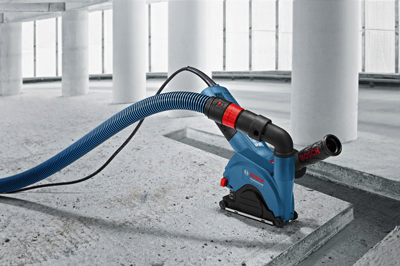 Systemzubehör GDE 115/125 FC-T, Die GDE 115/125 FC-T Professional ist Boschs „Full Cover”-Absaughaube für eine Vielzahl von Bosch Professional Winkelschleifern mit werkzeuglos einstellbarer Standardschutzvorrichtung und 115 mm oder 125 mm Scheibendurchmesser. Ihr geschlossenes Design sorgt für eine optimierte Staubabsaugung und damit für nahezu staubfreies Arbeiten. Die Haube ist für einfaches Handling direkt am Winkelschleifer angebracht. Zusätzlich mit einstellbarer Schnitttiefe und integrierten Rollen für Arbeiten, für die Präzision erforderlich ist. Die Absaughaube ist kompatibel mit dem Bosch Professional Click & Clean System.