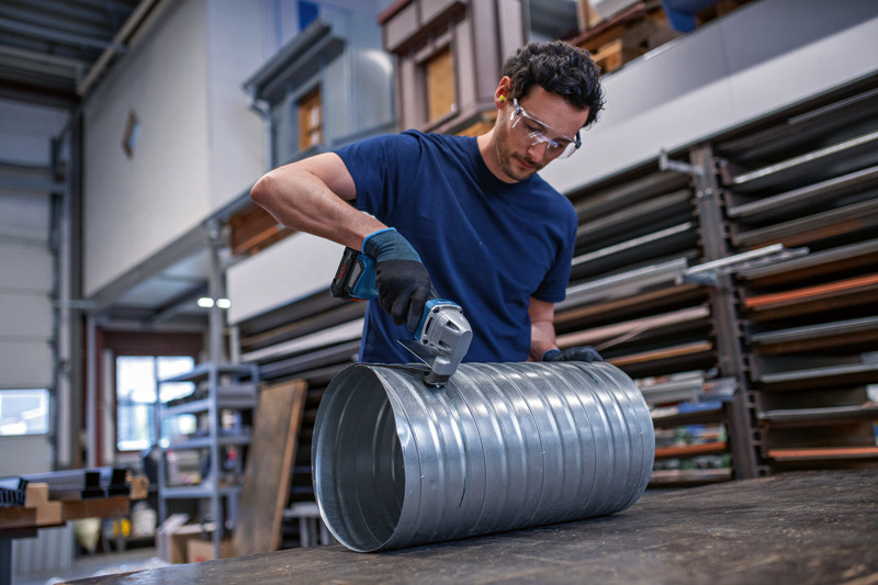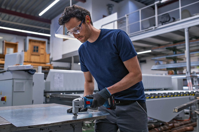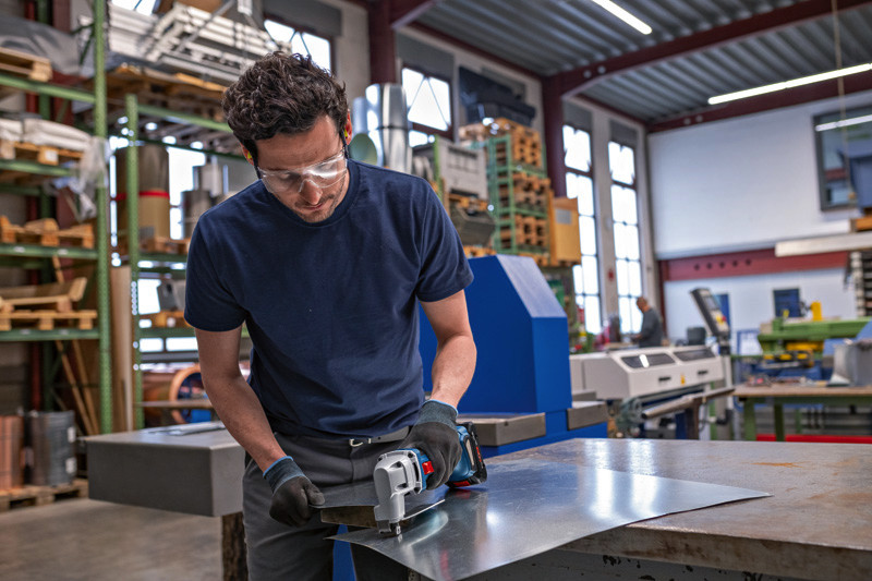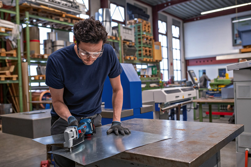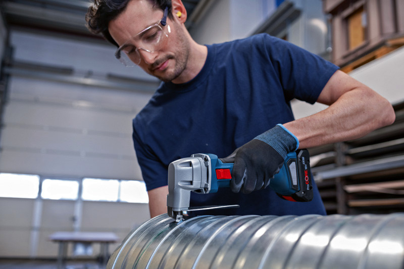 Akku-Blechschere GSC 18V-16 E, Die Akku-Blechschere GSC 18V-16 E schneidet dank effizientem bürstenlosem Motor so kraftvoll wie ein kabelgebundenes 700-W-Werkzeug. Die perfekte Balance der Schere, ihr geringes Gewicht und der schmale Griffumfang von 156 mm sorgen für eine mühelose Handhabung bei der Arbeit. Mit ihrem Hochqualitätsdesign, dem starken bürstenlosen Motor und wartungsfreien Bauteilen ist diese robuste und langlebige Schere die ideale Wahl für kraftvolles Schneiden in Metall. Die kraftvolle Blechschere schneidet verschiedenste Stahl- und Aluminiumbleche, Lüftungsrohre und Kanäle. Das Gerät ist kompatibel mit allen Bosch Professional 18V-Akkus und -Ladegeräten (Professional 18V System). Auch kompatibel mit AMPShare, der markenübergreifenden Akku-Allianz. Die Schere eignet sich zum Schneiden von Metall bis zu 1,6 mm Tiefe und bietet einen minimalen Kurvenschnittradius von 20 mm. Sie bietet Wiederanlaufschutz für erhöhten Anwenderschutz. Karton. 1 x Ober- und Untermesser für Blechschere (2 608 635 243)