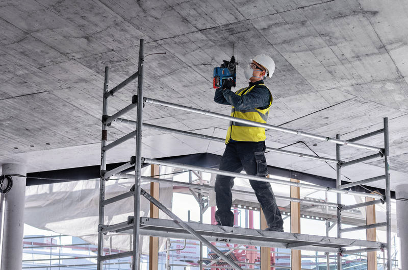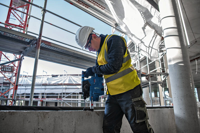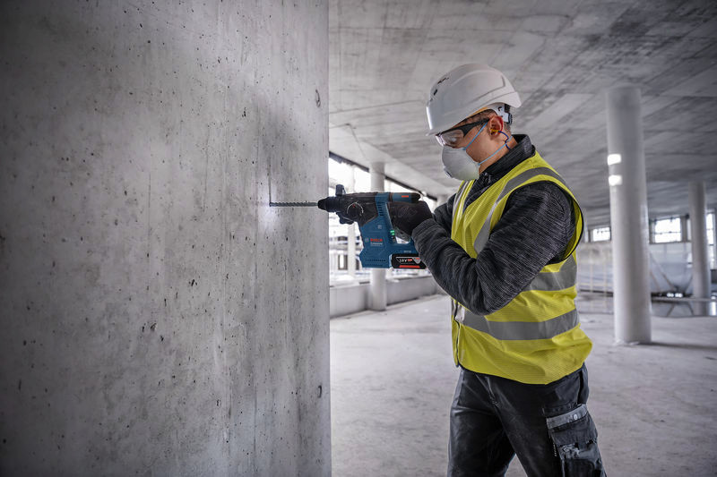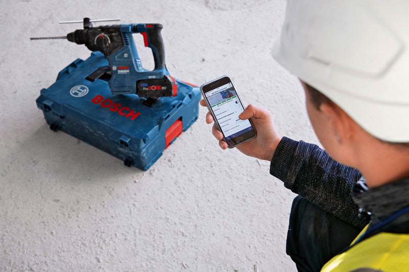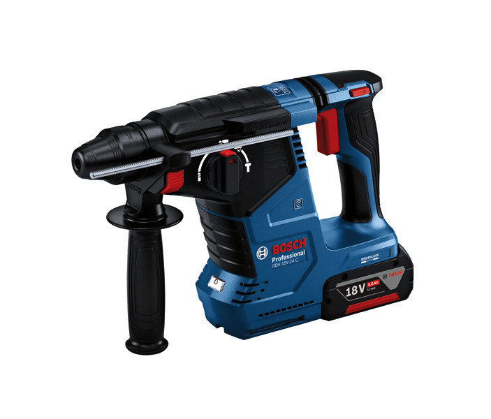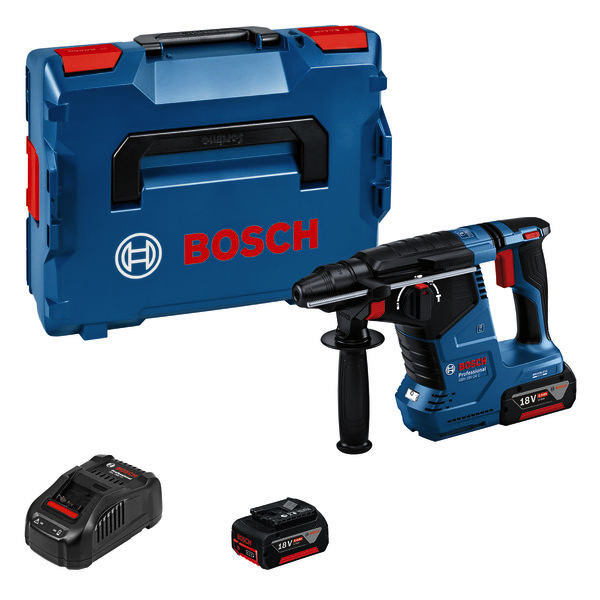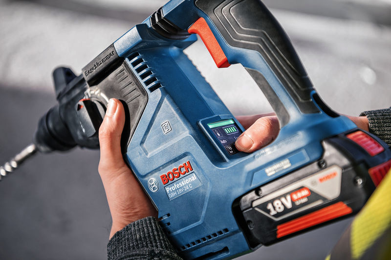 Akku-Bohrhammer mit SDS plus GBH 18V-24 C, Der GBH 18V-24 C Professional ist ein Allrounder aus dem Bosch SDS plus-Akku-Bohrhammer-Segment – perfekt für den täglichen Einsatz. Er ist mit einem bürstenlosen Motor ausgestattet und bietet mit KickBack Control und Vibration Control höheren Verletzungsschutz für den Anwender. Sein HMI-Display informiert bequem über den Akkustatus und sonstige anwenderrelevante Hinweise. Sein eingebautes Bluetooth Connectivity-Modul erlaubt eine schnelle und einfache Verbindung mit der Bosch Toolbox App für individuelle Einstellungen. Er ist kompatibel mit Boschs in sich geschlossenem Staubabsaugsystem GDE 18V-16 Professional, das mit nur einem Klick am Bohrhammer befestigt werden kann. Der GBH 18V-24 C Professional eignet sich zum Bohren und Meißeln in Beton und Mauerwerk. Er ist mit allen Akkus und Ladegeräten aus dem Bosch Professional 18V System kompatibel. Auch kompatibel mit AMPShare, der markenübergreifenden Akku-Allianz. Außerdem mit Constant Speed, Electronic Motor Protection (EMP), LED-Licht, Rotation Control Clutch, variabler Drehzahl und Vario-Lock. 2 x Akku GBA 18V 5.0Ah (1 600 A00 1Z6). Schnellladegerät GAL 1880 CV (1 600 A00 B8G). L-BOXX 136 (1 600 A01 2G0). L-BOXX-Einlage (1 600 A02 SJ4). Zusatzhandgriff (2 602 205 141). Tiefenanschlag (1 613 001 009). Reinigungstuch (1 619 200 413)