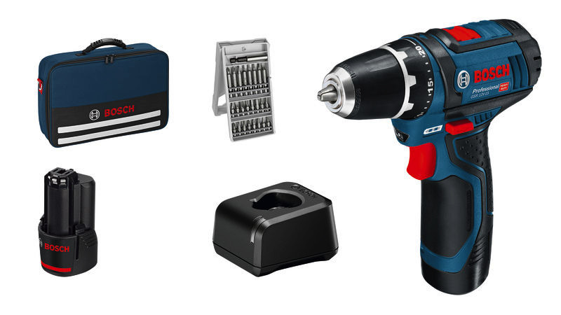Akku-Bohrschrauber GSR 12V-15, Der Akku-Bohrschrauber GSR 12V-15 Professional bietet in der 12-Volt-Klasse von Bosch ein ausgewogenes Verhältnis zwischen Leistung und Größe. Sein hartes Drehmoment von 30 Nm und 0-1.300 U/min sorgen für das beste Verhältnis zwischen Größe und Leistung. Sein kompaktes Design ermöglicht optimales Handling und ist ideal zum Arbeiten über Kopf und an engen Stellen. Überlastung, Überhitzung und Tiefentladung werden durch die Electronic Cell Protection des Bohrschraubers verhindert. Dieses Elektrowerkzeug wurde zum Bohren in Holz mit einem maximalen Durchmesser von 19 mm, in Stahl bis 10 mm und für Schraubdurchmesser bis 7 mm konzipiert. Das Gerät ist mit allen Bosch Professional 12-Volt-Akkus und -Ladegeräten kompatibel (Professional 12V System). Der GSR 12V-15 Professional verfügt außerdem über 2 Gänge, Autolock, Ladezustandsanzeige, Electronic Motor Protection und Lithium-Ionen-Technologie. 2 x Akku GBA 12V 2.0Ah (1 600 Z00 02X). Ladegerät GAL 12V-20 Professional. Bit-Set 25-tlg. Bosch Professional Werkzeugtasche 12V (1 600 A00 3BG)