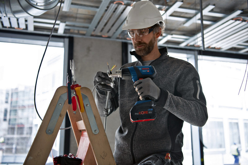 Akku-Heißluftgebläse GHG 18V-50, Arbeit unterwegs – Das GHG 18V-50 Professional wurde für eine flexible Verwendung in jeder Umgebung konstruiert. Ausgestattet mit einer Schnellaufheizung auf bis zu 300 °C innerhalb von 6 Sekunden verliert dieses Akku-Heißluftgebläse keine Zeit beim Erreichen der gewünschten Temperatur. Dank seiner ausgezeichneten Tragbarkeit und Flexibilität eignet sich das GHG 18V-50 hervorragend für jede Arbeitsumgebung, sogar große Baustellen ohne Stromversorgung. Mit seinen zwei Temperaturstufen (300 °C + 500 °C) und dem LED-Licht ist das Heißluftgebläse jederzeit leicht zu bedienen. Das GHG 18V-50 Professional eignet sich für zahlreiche Anwendungen, einschließlich Schlauchschrumpfen. Es ist kompatibel mit allen für unsere kabelgebundenen Heißluftgebläse erhältlichen Düsen sowie sämtlichen Bosch Professional 18V-Akkus und -Ladegeräten (Professional 18V System). Für maximale Leistung ProCORE18V ≥ 4,0 Ah verwenden. Auch kompatibel mit AMPShare, der markenübergreifenden Akku-Allianz. Bei Verwendung des Akkus ProCORE18V 8.0Ah bei 300 °C beträgt die Akkulaufzeit bis zu 21 Minuten. Karton. Reflektordüse, 32 x 33 mm (1 609 390 453). Reduzierdüse, 9 mm (1 609 201 797)