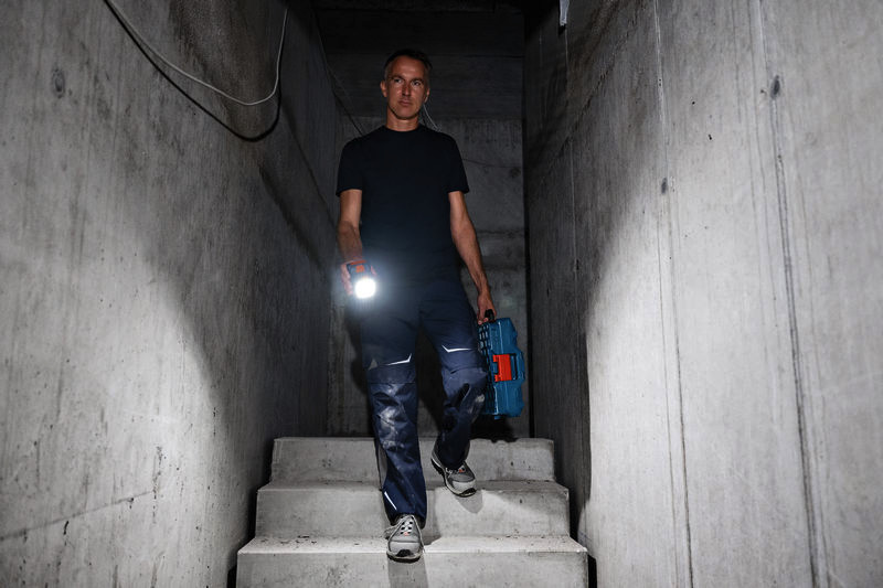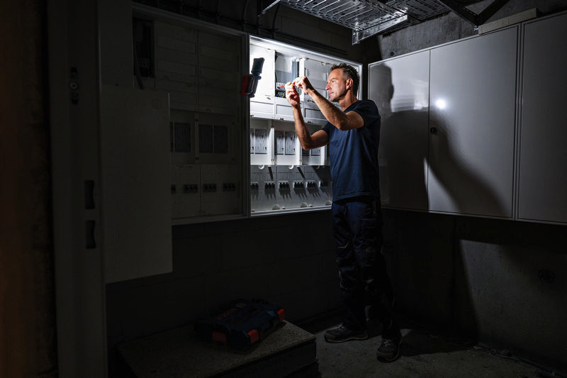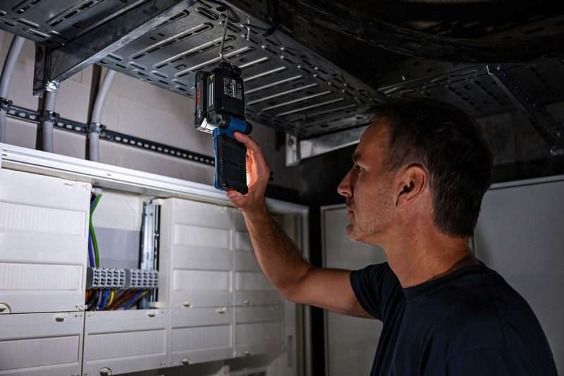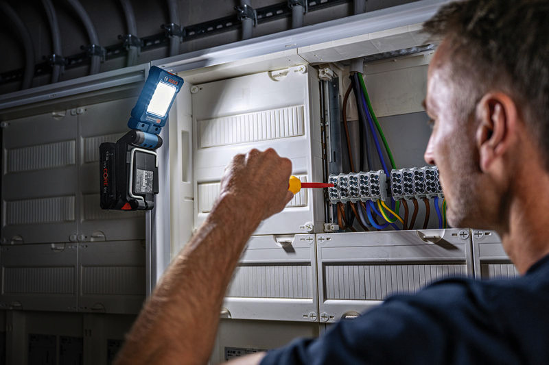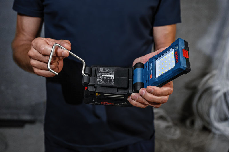 Akku-Leuchte GLI 18V-800, Die GLI 18V-800 Professional sorgt für eine hervorragende Beleuchtung des Arbeitsbereichs. Die 20 LEDs lassen sich mit 3 Helligkeitsstufen bis auf 800 Lumen einstellen. Das kompakte Design der Arbeitsleuchte, ihr starker Magnet und der Metall-Wirbelhaken sorgen für maximale Vielseitigkeit. Ihr innovativer Klappmechanismus mit 360°-Drehgelenk und einem um 180° schwenkbarem Leuchtenkopf bringen Licht in jede Ecke, und durch die Ein-Schalter-Bedienung ist sie leicht zu verwenden. Die GLI 18V-800 Professional beleuchtet kleine bis mittelgroße und enge Arbeitsbereiche, ideal für Elektro- und Sanitärarbeiten sowie sonstige Aufgaben. Die Arbeitsleuchte ist kompatibel mit allen 18V-Akkus und -Ladegeräten der AMPShare-Allianz einschließlich aller Akkus und Ladegeräte des Bosch Professional 18V System. Karton. Bedienungsanleitung