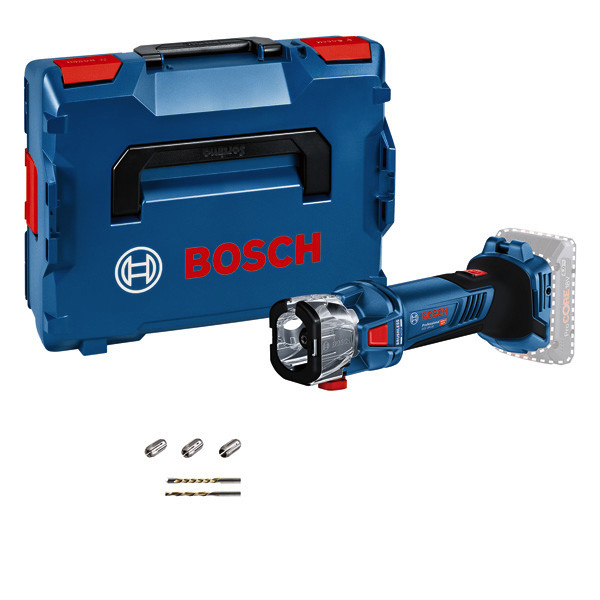 Akku-Trockenbaufräse GCU 18V-30, Dank ihrem kraftvollen bürstenlosen Motor mit einer Drehzahl von 30.000 min⁻¹ liefert die GCU 18V-30 den ganzen Tag Leistung und schneidet mehr als 100 Meter einer 12 mm dicken Trockenbauwand mit einem 1/8"-(3,17-mm-)Bit und einem einzigen ProCORE18V 4.0Ah-Akku. Die kompakte, leichte Bauweise ermöglicht bequemes Greifen in allen Positionen für länger ermüdungsfreies Arbeiten und ein staubdichter IP5X-Schalter, in den kein Trockenbaustaub eindringen kann, sorgt für eine höhere Werkzeuglebensdauer. Das Werkzeug ist geeignet für bündige Trockenbau-Schnitte nahe Fenstern, Türen, Zugangsplatten und Steckdosen. Sie schneidet auch Sperrholz, OSB und Deckenplatten, und ist kompatibel mit Spannzangen der Größen 3 mm, 6 mm, 1/8'', 5/32'', und 1/4''. Kompatibel mit dem Bosch Professional 18V System und mit der markenübergreifenden AMPShare Akku Allianz. Das Werkzeug wird standardmäßig mit 3 Spannzangen und einem hocheffizienten Staubadapter für einen gesünderen und saubereren Arbeitsort geliefert. Es verfügt auch über einen staubdichten IP5X-Schalter, der gegen feinen Trockenbaustaub und damit vorzeitigen Werkzeugausfall schützt, eine starke LED zur Beleuchtung des Schnittbereichs, eine Motorbremse für sofortiges Stoppen des Fräsers und einen Gürtelclip, damit du dein Werkzeug immer an deiner Seite hast. L-BOXX 136 (1 600 A01 2G0). 3 x Spannzange 3,17 mm (1/8") / 3,96 mm (5/32") / 6,35 mm (1/4") (2 608 000 826). 1 x Saugadapter (2 608 000 825). 1 x Trockenbau-Spiralnutfräser mit Führungsspitze, 3,17 mm (1/8"). 1 x Mehrzweckfräser 3,17 mm (1/8"). 1 x Gürtelhaken (2 609 111 584). Spannzangenschlüssel