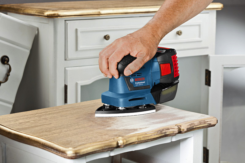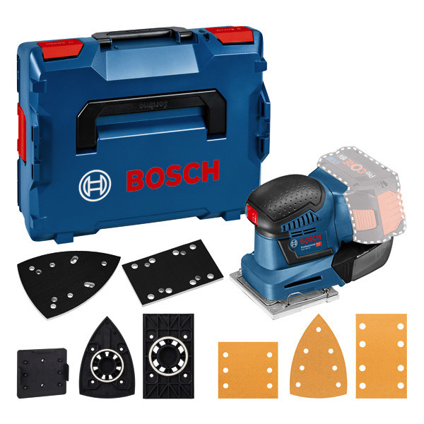 Akku-Schwingschleifer GSS 18V-10, Der GSS 18V-10 Professional ist Boschs kompakter und ergonomischer Akku-Schwingschleifer aus der 18V-Kategorie. Seine ergonomische Handablage und das kompakte Design garantieren eine einfache und bequeme Handhabung. Ein robustes Metallblech sorgt für Haltbarkeit bei intensiver Verwendung. Das Klemmsystem mit Klett-Schaumstoffplatte ermöglicht einen einfachen Wechsel und Ersatz des Schleifpapiers. Der Schleifer eignet sich zum Zwischenschleifen und Feinschleifen kleiner, flacher Oberflächen. Es ist einsetzbar auf Holz, Furnier, Lack, Füllmasse sowie Mineral- und Acryloberflächen. Kompatibel mit dem Bosch Professional 18V System und mit der markenübergreifenden AMPShare Akku Allianz. Der GSS 18V-10 Professional verfügt außerdem über eine Staubbox mit integriertem Bosch Microfilter-System sowie auswechselbare Schleifplatten und er kann einhändig bedient werden. L-BOXX 136 (1 600 A01 2G0). L-BOXX-Einlage. Lochwerkzeug (2 608 190 059). Microfilter Box. Schraubendreher. 1 x Schleifblatt C470, Best for Wood + Paint, 120 (separat erhältlich als 10er-Pack: 2 608 607 232). 1 x Schleifblatt C470, Best for Wood + Paint, 120 (separat erhältlich als 10er-Pack: 2 608 607 458). 1 x Schleifblatt C470, Best for Wood + Paint, 120 (separat erhältlich als 10er-Pack: 2 608 608 Z96). (Delta) Grundplatte, 100 x 150 mm (2 608 601 448) mit Schleifplatte (2 608 601 445). Grundplatte, 113 x 101 mm (2 608 601 446) mit Schleifplatte (2 608 601 443). Grundplatte, 80 x 130 mm (2 608 601 447) mit Schleifplatte (2 608 601 444)