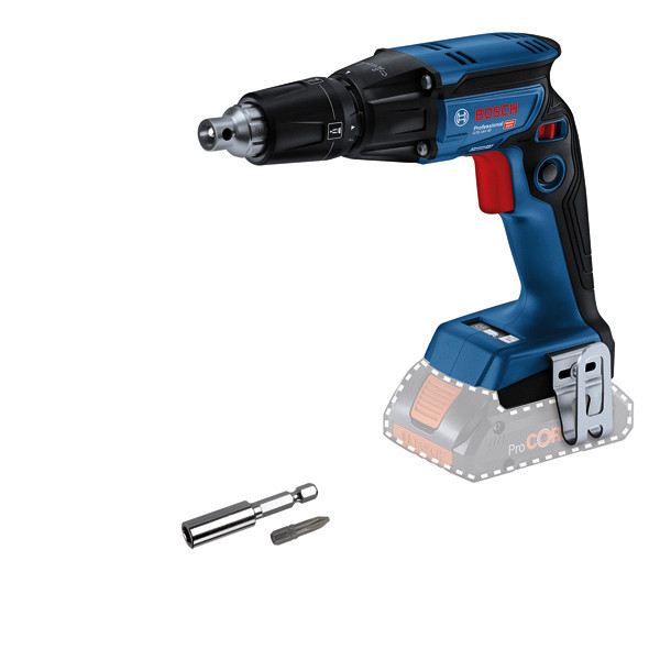Akku-Trockenbauschrauber GTB 18V-45, Der Akku-Trockenbauschrauber GTB 18V-45 Professional bietet PowerSAVE-Modus, einen bürstenlosen Motor und einen einziehbaren Tiefenanschlag für maximalen Bedienkomfort. Für leiseres Arbeiten wird der Motor im PowerSAVE-Modus automatisch erst aktiviert, wenn die Schraube die Wand berührt. Im Vergleich zum ausgeschalteten PowerSAVE-Modus wird dadurch die Laufzeit deutlich verlängert und die Anzahl der Schrauben pro Akkuladung erhöht. Für schnelles und müheloses Arbeiten ist der Tiefenanschlag einziehbar und muss nicht mehr zum Lösen von Schrauben entfernt werden. die Tiefeneinstellung bleibt hierbei unverändert. Seine schlanke Form und sein geringes Gewicht von weniger als 1 kg garantieren ein exzellentes Handling. Der GTB 18V-45 Professional wurde zum Festziehen von Trockenbauschrauben mit bis zu 6 mm Durchmesser konstruiert. Er ist kompatibel mit allen Bosch Professional 18V-Akkus und -Ladegeräten (Professional 18V System) und mit den Bosch Professional Magazinaufsätzen für Trockenbauschrauber. Auch kompatibel mit AMPShare, der markenübergreifenden Akku-Allianz. Er ist ausgestattet mit Electronic Motor Protection (EMP), Motorbremse, Arretierschalter, Gürtelclip und Rechts-/Linkslauf. Karton. 1 x Schraubendrehereinsatz (Bit) Ph 2. 1 x Gürtelclip, 1 x Bithalter