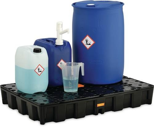 für Kleingebinde · zur sicheren und vorschriftsmäßigen Lagerung gewässergefährdenden Flüssigkeiten der GHS-Kategorien 1-4 · aus HD-Polyethylen · sehr beständig gegen Laugen, Öle und Säuren · stapelbar · rutschsichere Plattenoberfläche · konzipiert für Kombination auf Europalette · mit DIBT-Zulassung Nr. Z-40.22-548 und Z-40.22-549 Weitere technische Eigenschaften: · Gewicht: 12,8kg · Tragfähigkeit: 500kg