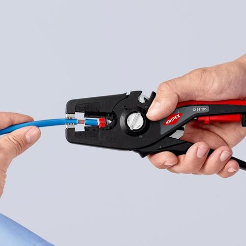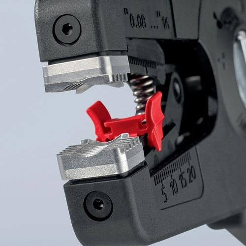 selbsteinstellend · einfaches, präzises Abisolieren und Schneiden von feindrähtigen bis massiven Rundkabeln im großen Kapazitätsbereich von 0,08 bis 16mm² mit nur einer Zange · Kabelschneider bis 16 mm² · bei Bedarf kann optional feinjustiert werden, z. B. in Extrembereichen · guter Grip durch halbrunde Metall-Haltebacken mit Kammprofil · parabelförmige Abisoliermesser für exakten Schnitt · leicht auswechselbare Messerkassette · einstellbarer Längenanschlag · Beschriftungsfeld zur Individualisierung · Gehäuse: aus glasfaserverstärktem Kunststoff · Messer: Spezial-Werkzeugstahl, ölgehärtet Weitere technische Eigenschaften: · Gehäuse: Kunststoff, glasfaserverstärkt