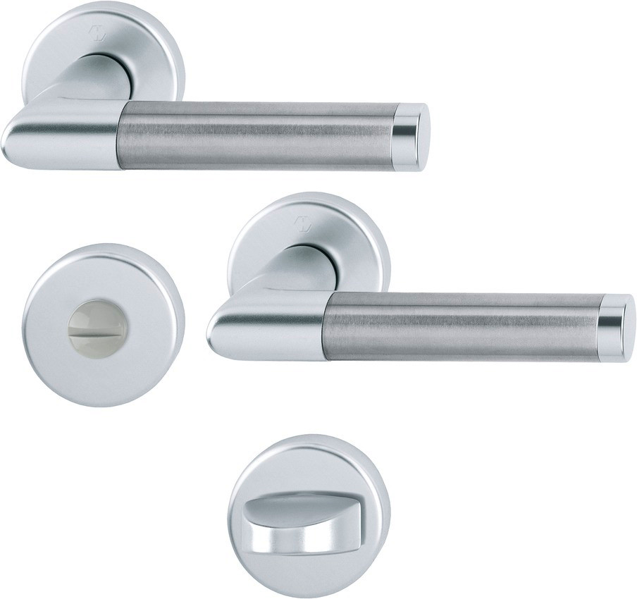 Zimmertür Drückergarnitur Modell Amsterdam mit runden Rosetten, mit Kunststoff-Unterkonstruktion, Rückholfederpaket und verdeckte, durchgehende Verschraubung mit selbstschneidenden Gewindeschrauben, mit Schnellstift-Verbindung.