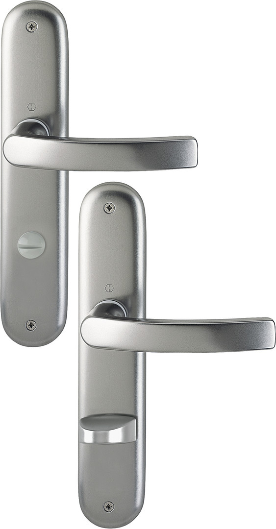Drückergarnitur Luxemborg mit Langschild, Türgriffe lose, Rückholfedern rechts/links verwendbar, wartungsfreie Gleitlager, mit Schnellstift-Verbindung, sichtbar, Mehrzweckschrauben.