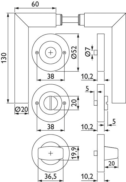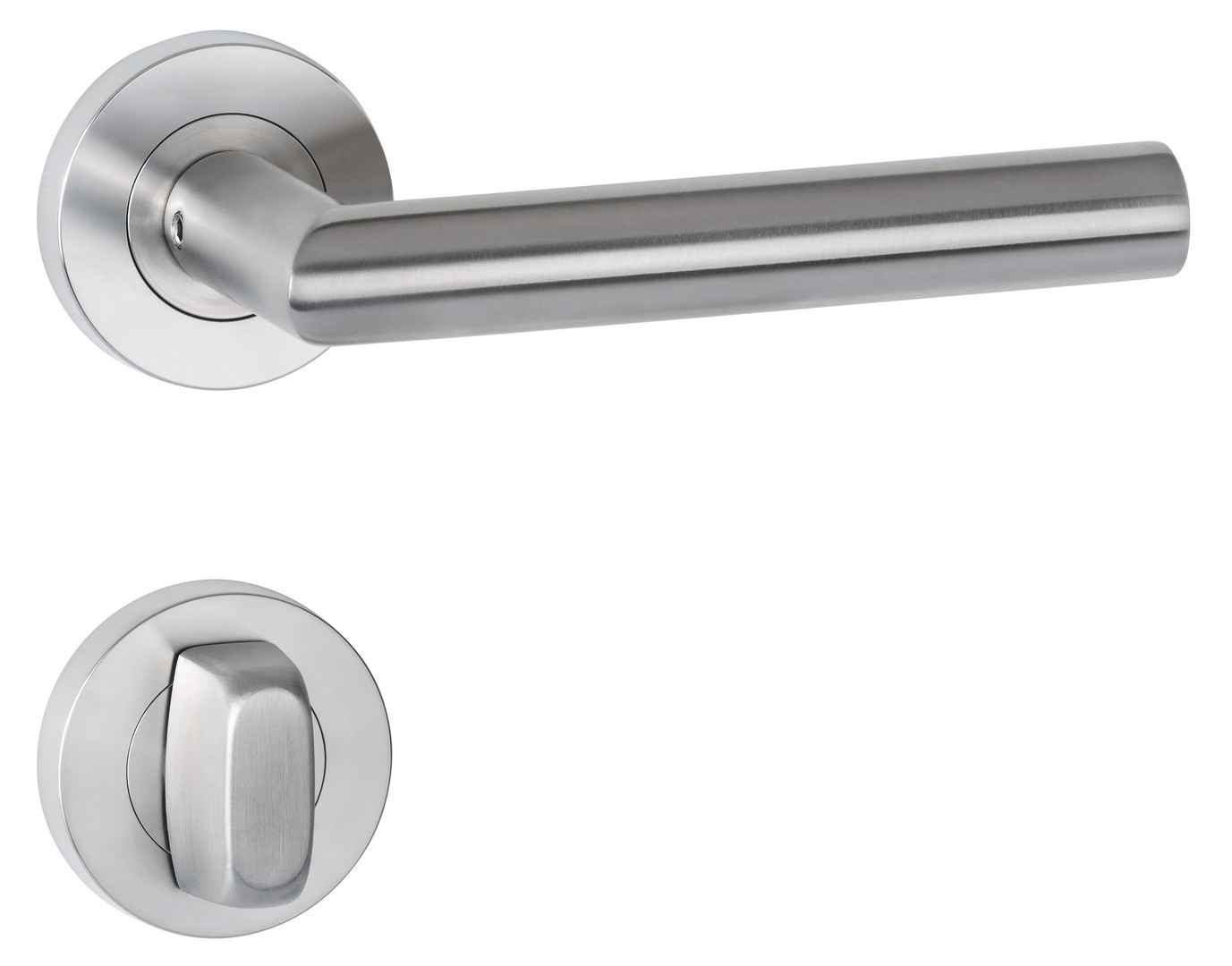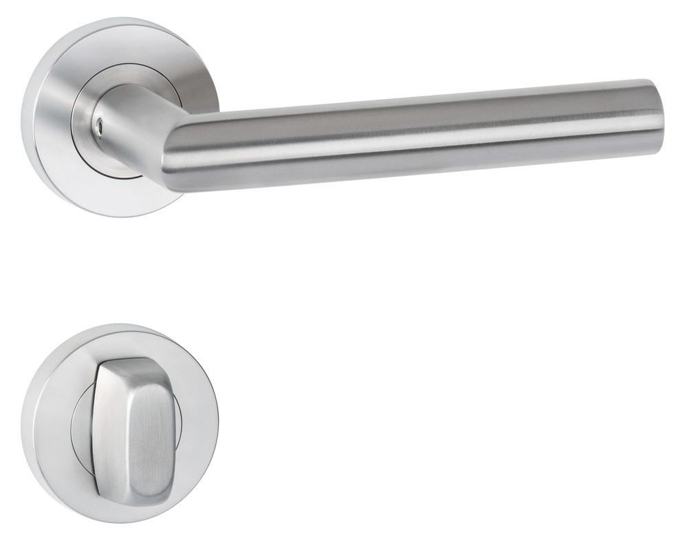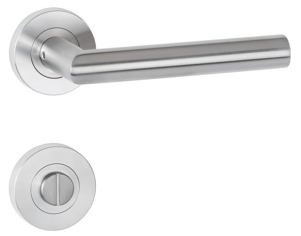 Bad-Drückergarnitur 1802 BASIC 02 mit Schraubrosette 2061, fest/drehbar Ausf.: BAD, mit WC-Riegel 3221/3216, 6 mm Vierkant mit Hülsen 7/8 mm, Türstärke 38 - 45 mm Oberfl. 60 (Edelstahl matt)