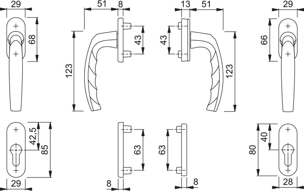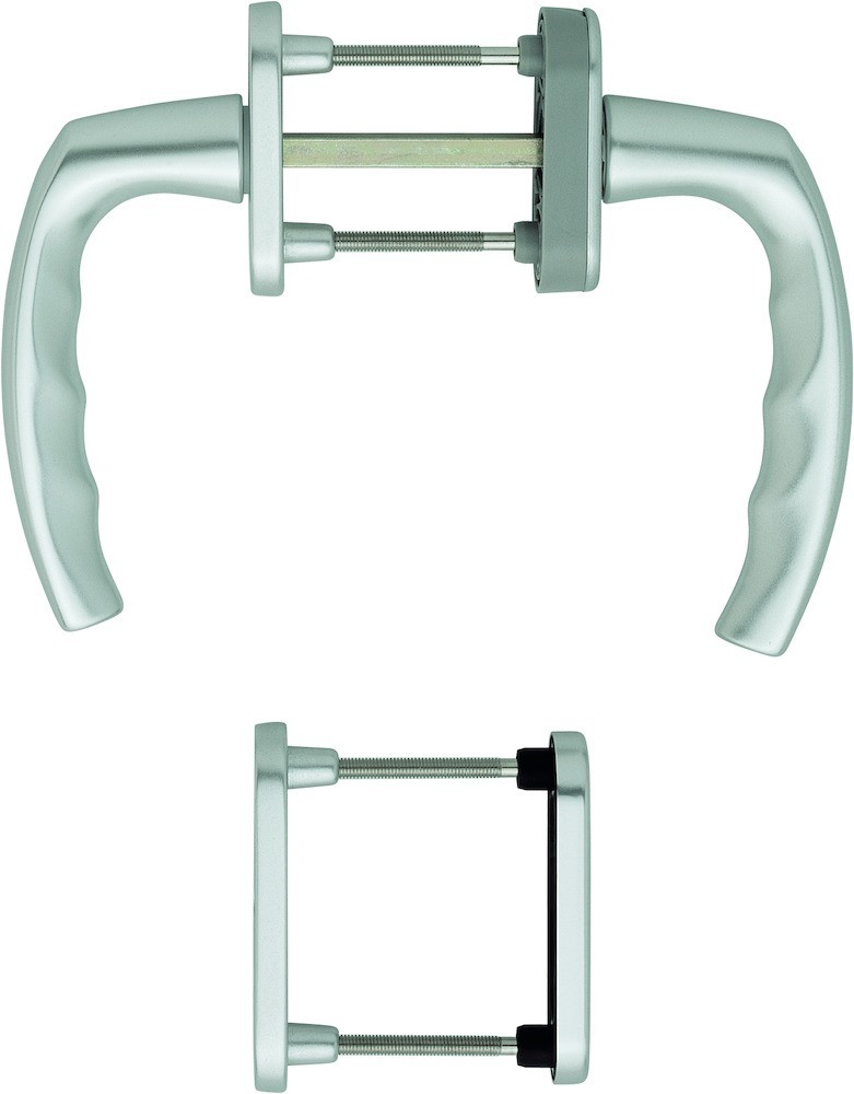 Garnitur / F1 Aluminium silberfarben / N10A, mit Arretierung, aluminiumsilber / 7 mm / Profilzylinder / 63-73 mm / aussen=ohne Rastung, innen=90° / HOPPE-Logo