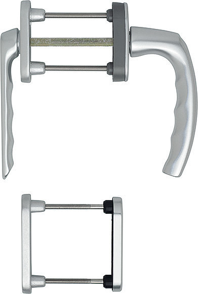 Garnitur / F1 Aluminium silberfarben / N10A, mit Arretierung, aluminiumsilber / 7 mm / Profilzylinder / 63-73 mm / aussen=ohne Rastung, innen=90° / HOPPE-Logo