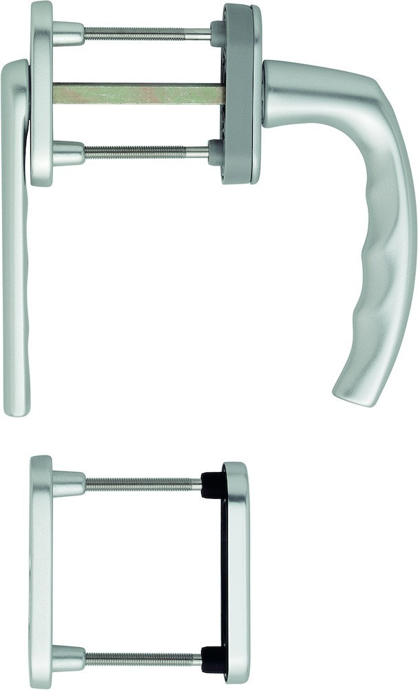 Balkontür-Rosetten-GarniturGarnitur / F1 Aluminium silberfarben / N12A, mit Arretierung, aluminiumsilber / 7 mm / Profilzylinder / 78-83 mm / aussen=ohne Rastung, innen=90° / HOPPE-Logo