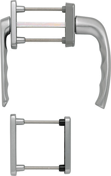 Balkontür-Rosetten-GarniturGarnitur / F9 Aluminium stahlfarben / N10A, mit Arretierung, stahlgrau / 7 mm / Profilzylinder / 73-83 mm / aussen=ohne Rastung, innen=90° / HOPPE-Logo