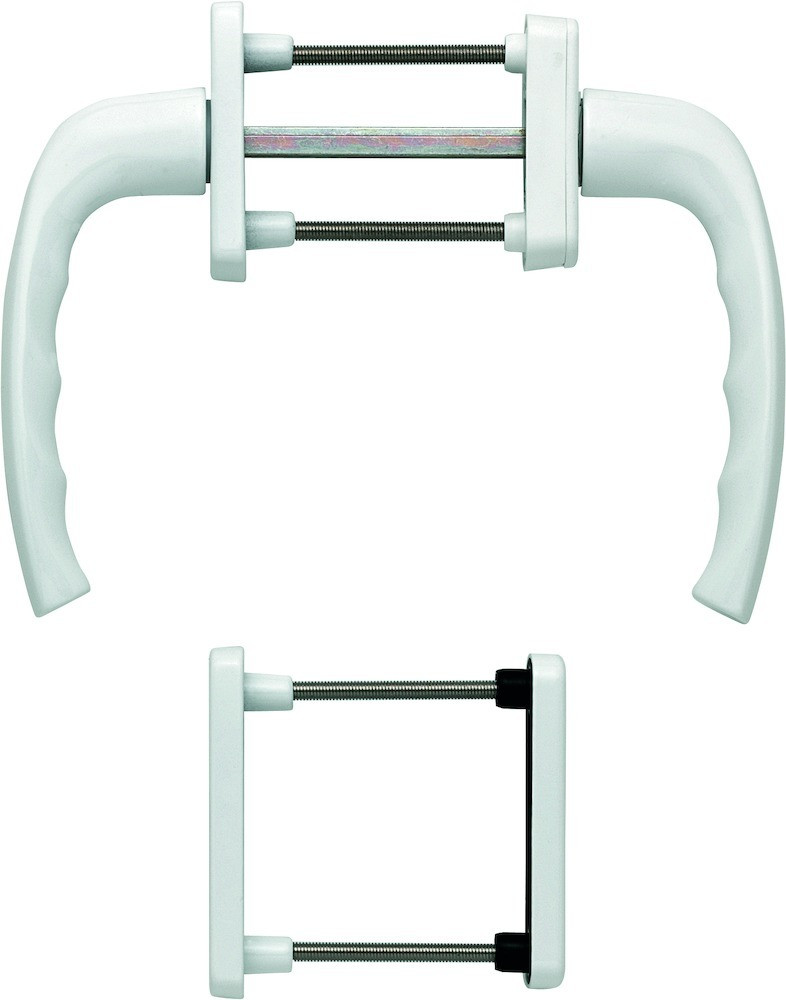 Balkontür-Rosetten-GarniturGarnitur / F9016 verkehrsweiß / N10A, mit Arretierung, weiß / 7 mm / Profilzylinder / 73-83 mm / aussen=ohne Rastung, innen=90° / HOPPE-Logo