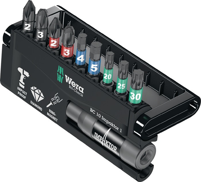 mit IMPAKTOR-Technologie für härteste Schraubbedingungen und Impakt-Schrauber-Maschinen · Bits diamantbeschichtet · Take it easy Tool Finder System Inhalt: 1 Bit-Halter IMPAKTOR mit Ringmagnet und Sprengring (75 mm lang) Bits für Schrauben mit Kreuzschlitz (PZD) 3 St. Gr. 2 / 1 St. Gr. 3** Bits für Schrauben mit Innen-TORX®-Profil 3 St. Gr. T 25 / 1 St. Gr. T 30 / 1 St. Gr. T 40** **= Bitlänge jeweils 25 mm Weitere technische Eigenschaften: · Lieferung: in Kunststoffbox