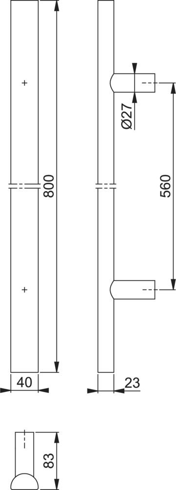 Bügelgriff, Stangenform, D-ProfilF69 Edelstahl matt / 800 mm / 560 mm / 2 / 120 mm / 680 mm / BS-1102 (für einseitige Befestigung bzw. für Bügelgriffe mit einem Ø von 25, 30 o. 34 mm) / Stück / HOPPE-Logo