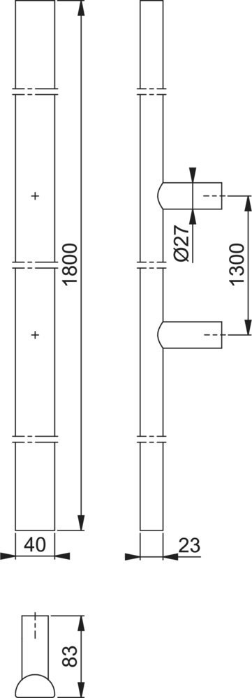 Bügelgriff, Stangenform, D-ProfilF69 Edelstahl matt / 1800 mm / 1300 mm / 2 / 250 mm / 1550 mm / BS-1102 (für einseitige Befestigung bzw. für Bügelgriffe mit einem Ø von 25, 30 o. 34 mm) / Stück / HOPPE-Logo