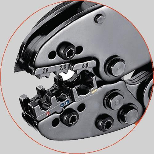 für PVC- und Polyamid-isolierte Verbinder im Querschnittsbereich von 0,5 - 6 mm² (~ AWG 20... 10) · mit Anschlag zur exakten Positionierung der Kontakte · Zwangssperre garantiert Qualitätscrimp · Entriegelungsmöglichkeit bei evtl. Fehlbedienung · für Kabelschuhe, Stiftkabelschuhe, Parallel- und Serienverbinder sowie Steckverbinder · niedrigere Handkräfte durch geschlitzte Pressung Weitere technische Eigenschaften: · Gewicht: 747g · Griff: 2-Komponentenhüllen