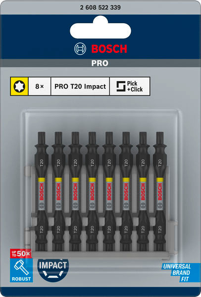 Robustes Eindrehen von Schrauben! Benötigst du Schrauberbits, die für anspruchsvolle Installationsaufgaben geeignet sind? Die Bits, die stark sind, lange halten und leicht zu identifizieren sind? Probiere PRO Impact PH2. Sie wurden aus modifiziertem Stahl hergestellt, um sicherzustellen, dass sie stark sind. Wir haben sie an beiden Enden mit Schrauberköpfen versehen, um ihre Lebensdauer zu verdoppeln. Durch die Lasermarkierungen kannst du den benötigten Bit im Handumdrehen auswählen. PRO Impact PH2 Bits mit Doppelklinge sind eine gute Wahl für Installateure, die starke und langlebige Schrauberbits für schwere Anwendungen benötigen. Die Bits bestehen aus wärmebehandeltem, modifiziertem Stahl für hervorragende Stabilität und Widerstandsfähigkeit gegen hohe Drehmomente. Ihre Torsionszone absorbiert die Drehmomentbelastung an der Spitze der Bits, um sicherzustellen, dass sie nicht brechen. Die Bits haben an beiden Enden Köpfe, was dadurch ihre Lebensdauer erhöht. Die Bits haben einen farbcodierten Ring, der den Kopftyp anzeigt, sowie Lasermarkierungen, die dir bei der Auswahl der benötigten Größe helfen. Das Set wird in einem Pick and Click-Halter aus Kunststoff geliefert, in dem du deine Bits gut organisiert aufbewahren kannst.