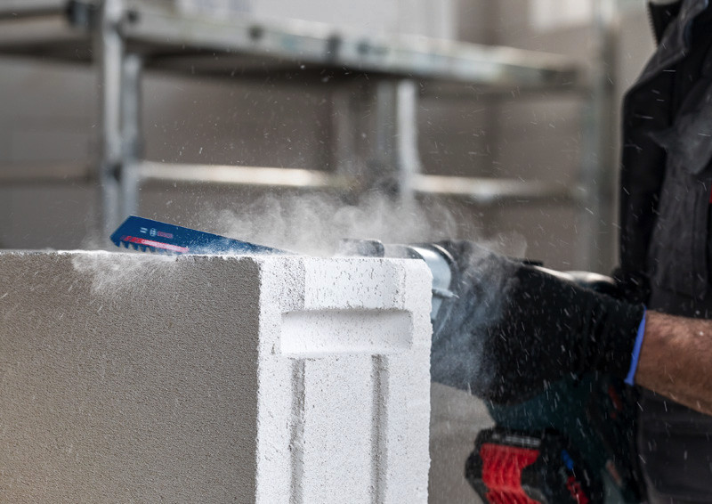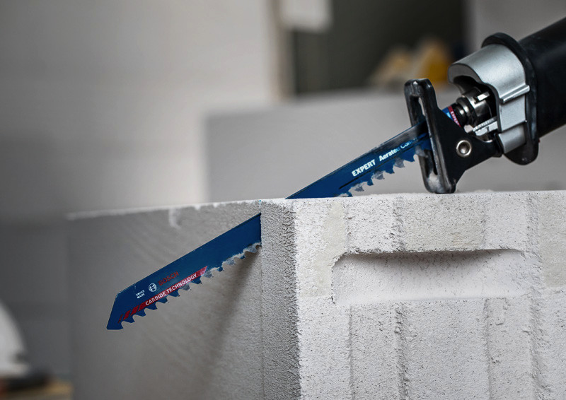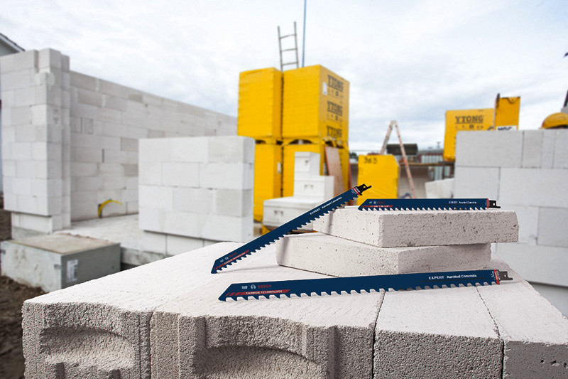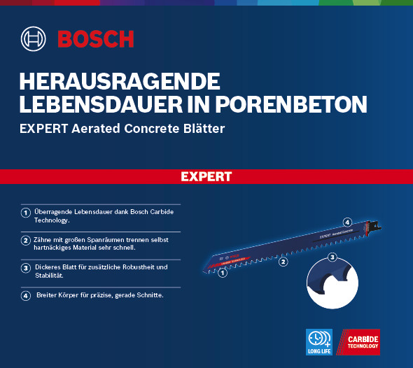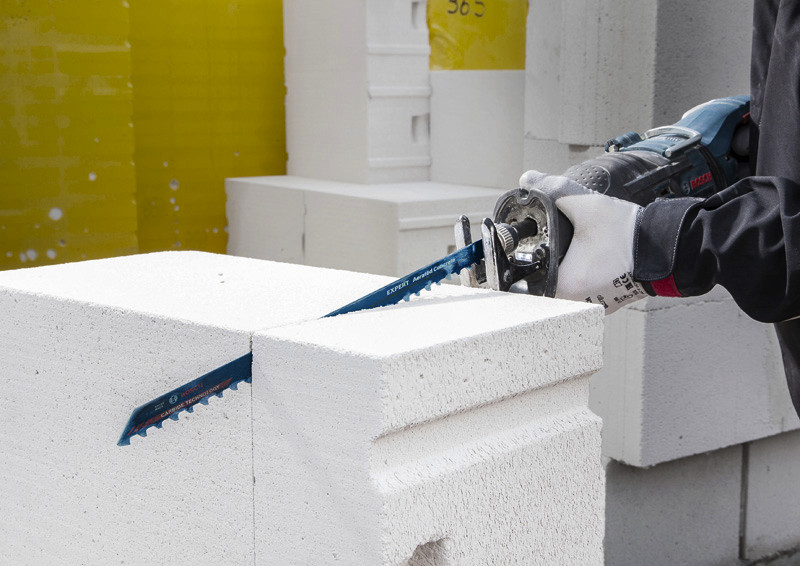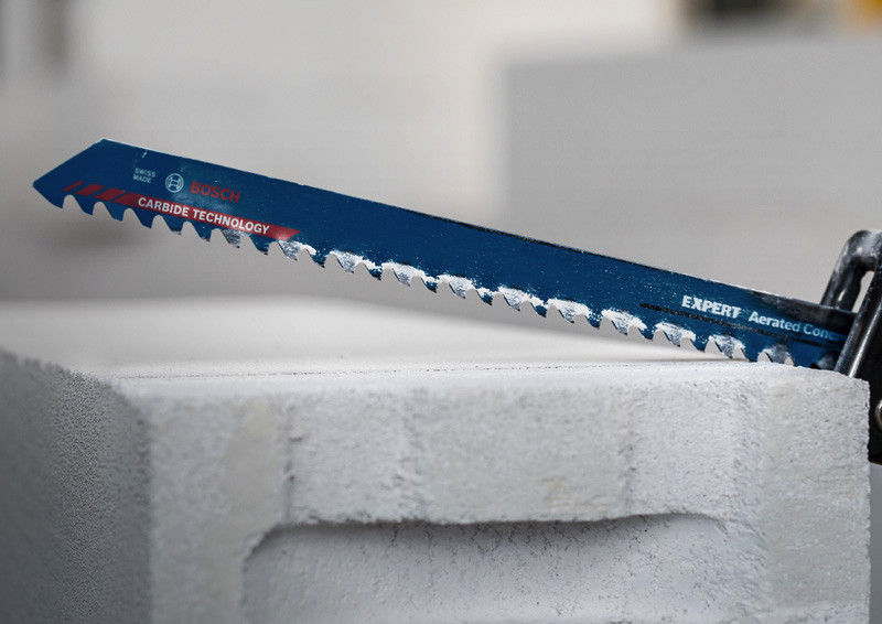 Herausragende Lebensdauer in Porenbeton! Zähne mit großen Spanräumen trennen selbst hartnäckiges Material sehr schnell Porenbetonblöcke sind eines der häufigsten Materialien im modernen Wohnungsbau. Die Fähigkeit, diese großen Blöcke schnell und genau zuzuschneiden, bedeutet für Handwerker einen enormen Effizienzgewinn. Porenbeton ist allerdings stark abrasiv. Das EXPERT Aerated Concrete kann dieses Problem dank des fortschrittlichen Designs der Carbide-Zähne angehen. Bevor es Carbide-Säbelsägeblätter gab, konnte man sich nicht vorstellen, Porenbetonblöcke einfach und bequem zu schneiden. Das Bosch EXPERT Aerated Concrete-Säbelsägeblatt läutet nun eine neue Ära ein. Überragende Lebensdauer dank Bosch Carbide Technology