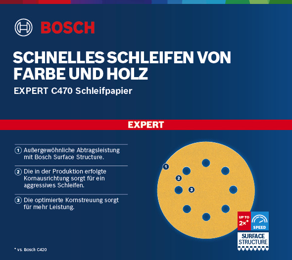 Schnelles Schleifen von Farbe und Holz! Die in der Produktion erfolgte Kornausrichtung sorgt für ein aggressives Schleifen Das Schleifen großer Flächen ist zeitaufwändig: Viele Schleifpapiere setzen sich schnell mit Staub zu und verlieren ihre Abrasivität, wodurch der eigentliche Schleifprozess mehr Zeit benötigt. Durch die Kombination von scharfen Körnern und spezieller Technologie, welche das Zusetzen verhindert, behält das EXPERT C470 Schleifpapier seine besonderen Fähigkeiten bei. Dies bedeutet, dass du schneller und länger arbeiten kannst, ohne Kompromisse beim Schleifergebnis eingehen zu müssen. Verbringe weniger Zeit mit dem Schleifen oder erledige mehr Arbeiten in der gleichen Zeit – mit dem Bosch EXPERT C470 Schleifpapier. Außergewöhnliche Abtragsleistung mit Bosch Surface Structure