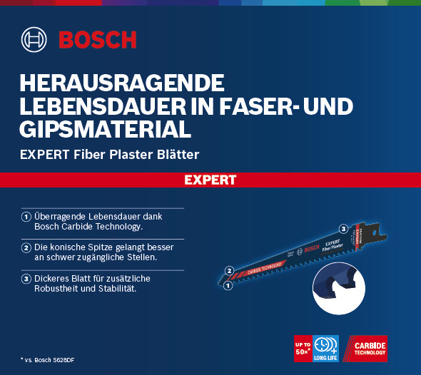 Herausragende Lebensdauer in Faser- und Gipsmaterial! Die konische Spitze gelangt besser an schwer zugängliche Stellen Die bloße Abrasivität von Zementfaserplatten machen sie zu einem der am schwierigsten zu bearbeitenden Materialien für dein Säbelsägeblatt. Für Installateure, Klempner, Elektriker und andere Handwerker, die Wartungs- und Restaurierungsarbeiten durchführen müssen, ist das Schneiden dieser Bretter jedoch unerlässlich. Das Bosch EXPERT Fibre Plaster S641HM-Säbelsägeblatt ist ein praktischer Spezialist für jeden Handwerker, der Zementfaserplatten und Trockenbauwände schneiden muss. Durch seine hervorragende Ausdauer bietet es ein großartiges Preis-Leistungs-Verhältnis. Überragende Lebensdauer dank Bosch Carbide Technology