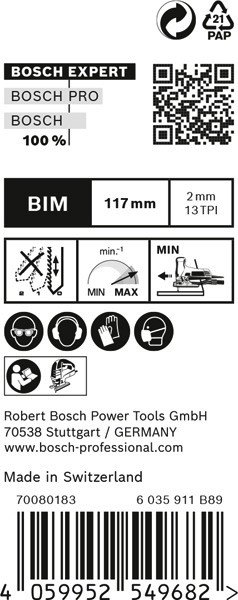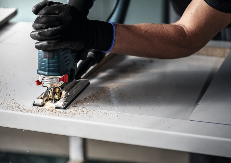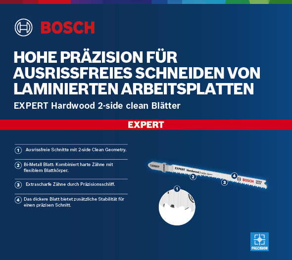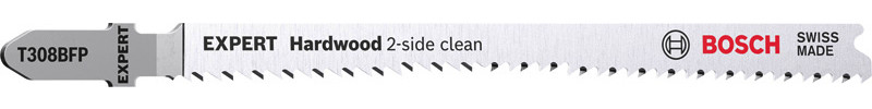Hohe Präzision für ausrissfreies Schneiden von laminierten Arbeitsplatten! Bi-Metall Blatt: Kombiniert harte Zähne mit flexiblem Blattkörper Unter Tischlern und Schreinern war es schon immer eine Kunst sicherzustellen, dass der sichtbare Teil des Arbeitsmaterials die „saubere Seite“ eines Stichsägenschnitts zeigt. Manchmal muss man das Werkstück zum Sägen umdrehen. Oder die Stichsäge sägt von der Rückseite, um die gewünschte Schnittqualität auf der Sichtseite zu haben. Oder du verwendest das EXPERT Hardwood 2-side clean-Blatt, das dank seiner Zahngeometrie auf beiden Seiten einen perfekten, ausrissfreien Schnitt bietet. Hergestellt aus Bi-Metall – einer Leiste aus Schnellarbeitsstahl, die auf ein flexibles Stahlblatt geschweisst wird, um Festigkeit und Flexibilität zu kombinieren – ist das Bosch EXPERT Hardwood 2-side clean-Stichsägeblatt robust genug, um beschichtete Küchenplatten aus Grobspanplatten oder Hartholz zu schneiden. Erhältlich für ausrissfreie, gerade Schnitte (T308BF) und für besonders genaue ausrissfreie Winkelschnitte (T308BFP). Ausrissfreie Schnitte mit 2-side Clean Geometry