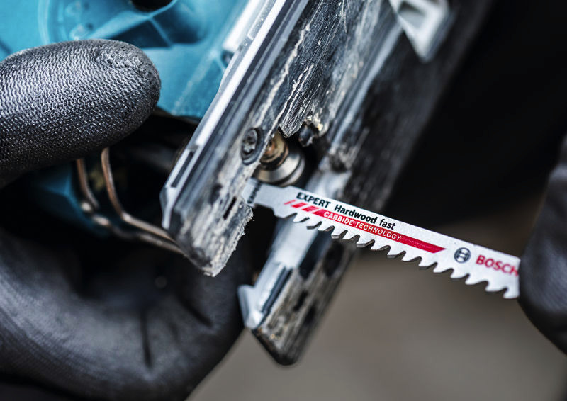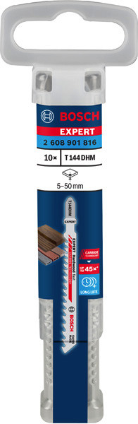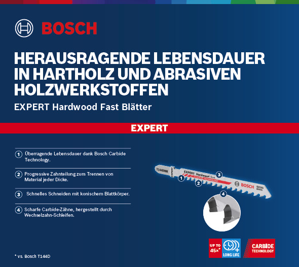 Herausragende Lebensdauer in Hartholz und abrasiven Holzwerkstoffen! Progressive Zahnteilung zum Trennen von Material jeder Dicke Arbeiten wie das Schneiden von modernem Abdeckmaterial für eine Terrasse oder einen Balkon sind sehr anstrengend. Sie erfordern jedoch immer noch den sauberen, präzisen Schnitt mit einer Stichsäge. Leider neigten zähe oder abrasive Materialien wie Holz-Kunststoff-Verbundstoffe dazu, Stichsägeblätter zu zerstören. Das ist nun nicht mehr der Fall: Das EXPERT Hardwood fast T144DHM hat Carbide-Zähne für eine weitaus höhere Lebensdauer. Das Bosch EXPERT Hardwood fast T144DHM-Stichsägeblatt schneidet auch MDF, Grobspanplatten, WPC, Gipskartonplatten und Faserplatten. Es bietet einen schnellen, qualitativ hochwertigen Schnitt, und das viel länger als herkömmliche Stichsägeblätter. Es ist die erste Wahl für Profis. Überragende Lebensdauer dank Bosch Carbide Technology