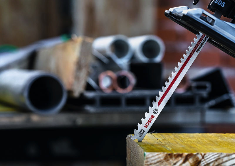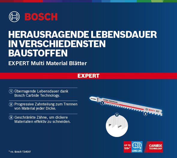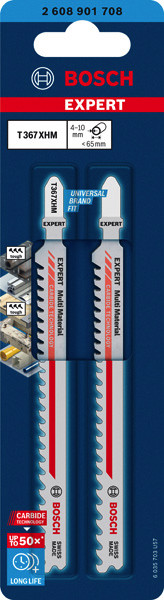 Herausragende Lebensdauer in verschiedensten Baustoffen! Progressive Zahnteilung zum Trennen von Material jeder Dicke Du benötigst ein Blatt, auf das du dich verlassen kannst. Ein Stichsägeblatt, das mit Bauholz mit eingebetteten Metallteilen umgehen kann. Oder mit Faserplatten. Oder auch mit harten Schrauben. Das EXPERT Multi Material thick and thin T367XHM-Blatt kann mühelos in mehreren Materialien eingesetzt werden und schneidet selbst dann noch, wenn andere Stichsägeblätter bereits verschlissen wären. Das Bosch EXPERT Multi Material thick and thin T367XHM-Stichsägeblatt kann die härtesten Holzwerkstoffe mit eingebettetem Metall und andere zähe Baumaterialien schneiden. Auf dieses Blatt kannst du dich verlassen. Überragende Lebensdauer dank Bosch Carbide Technology