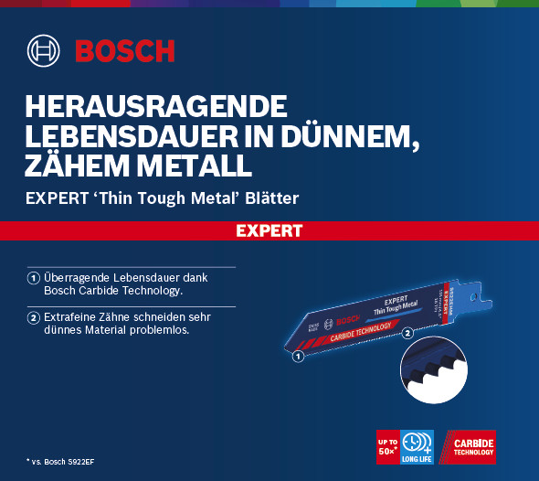 Herausragende Lebensdauer in dünnem, zähem Metall! Extrafeine Zähne schneiden sehr dünnes Material problemlos Das Schneiden von dünnem Blech und dünnwandigen Rohren ist eine schwierige Aufgabe. Mit einem guten Säbelsägeblatt ist dies allerdings möglich. Die wirklichen Probleme beginnen, wenn du Edelstahl schneiden musst. Dieser zähe, hochlegierte Stahl stellt Bau- oder Renovierungsarbeiter vor Schwierigkeiten und zerstört die Blätter häufig. Dank der Bosch Carbide Technology gehören diese Probleme der Vergangenheit an. Das Bosch EXPERT Thin Tough Metal -Säbelsägeblatt eignet sich ideal für Metallarbeiter, Klempner, Installateure und Renovierer. Es erledigt nicht nur Arbeiten, die bisher so gut wie unmöglich waren, sondern bietet auch eine außergewöhnliche Lebensdauer. Überragende Lebensdauer dank Bosch Carbide Technology
