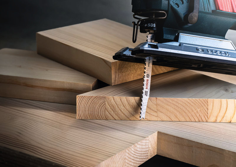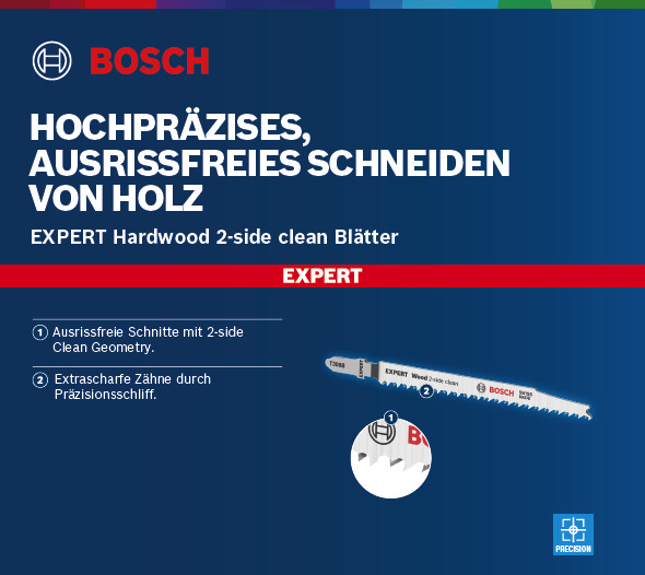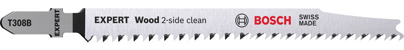 Hochpräzises, ausrissfreies Schneiden von Holz! Extrascharfe Zähne durch Präzisionsschliff Unter Tischlern und Schreinern war es schon immer eine Kunst sicherzustellen, dass der sichtbare Teil des Arbeitsmaterials die „saubere Seite“ eines Stichsägenschnitts zeigt. Manchmal muss man das Werkstück zum Sägen umdrehen. Oder die Stichsäge sägt von der Rückseite, um die gewünschte Schnittqualität auf der Sichtseite zu haben. Oder du verwendest das EXPERT Wood 2-side clean-Blatt, das dank seiner Zahngeometrie auf beiden Seiten einen perfekten, ausrissfreien Schnitt bietet. Mit seinen besonders scharfen, präzisionsgeschliffenen Zähnen eignet sich das Bosch EXPERT Wood 2-side clean-Stichsägeblatt gut zum Schneiden von Weichholz mit einer Dicke von bis zu 50 mm. Möbelschreiner können ein perfektes Ergebnis erzielen und verlieren nicht nach jedem Stichsägenschnitt Zeit durch Schleifen. Erhältlich für gerade Schnitte (T308B), für Kurvenschnitte (T308BO) und für genaue Winkelschnitte (T308BP). Ausrissfreie Schnitte mit 2-side Clean Geometry