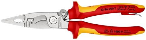 VDE-isoliert bis 1000 V · gefertigt gem. DIN EN/IEC 60900, stückgeprüft · für die Elektroinstallation · zum Greifen von Flach- und Rundmaterial, Biegen, Entgraten, Kabelschneiden, Abisolieren und Crimpen von Aderendhülsen · schlanke Bauform für gute Zugänglichkeit · Spezial-Werkzeugstahl in Sondergüte, geschmiedet, mehrstufig ölgehärtet mit integrierter isolierter Befestigungsöse zum Anbringen einer Absturzsicherung Zange verchromt Weitere technische Eigenschaften: · Querschnitt: 50mm²