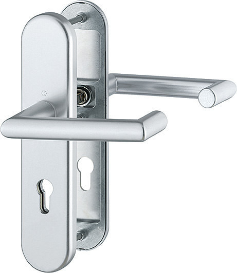 Garnitur / ES1 / F1 Aluminium silberfarben / 9 mm / Profilvollstift / Profilzylinder 72 mm / 42-47 mm / HOPPE-Logo