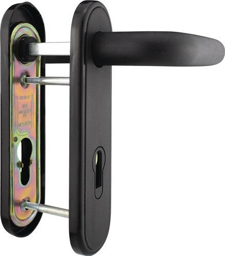 rund · mit 2 Befestigungsschrauben · Lochung PZ · Entfernung 72 mm · Vierkant 9 mm · Drücker fest/drehbar gelagert · Schilder mit Stahl-Unterplatten und Kunststoffblenden · für Türstärke 40-66 mm · DIN links / rechts verwendbar · Farbe schwarz Weitere technische Eigenschaften: · Vierkant: 9mm
