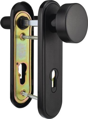 rund · mit 2 Befestigungsschrauben · Lochung PZ · Entfernung 72 mm · Vierkant 9 mm · Drücker fest/drehbar gelagert · Schilder mit Stahl-Unterplatten und Kunststoffblenden · für Türstärke 40-66 mm · DIN links / rechts verwendbar · Farbe schwarz Weitere technische Eigenschaften: · Vierkant: 9mm