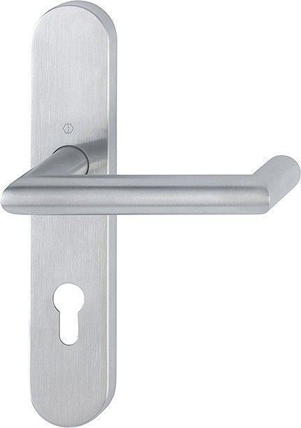 Garnitur / F69 Edelstahl matt / 9 mm / Profilvollstift / Profilzylinder 72 mm / 40-65 mm / fest/drehbar Kugelarretierung mit Rückholfeder / HOPPE-Logo / Gewindeschraube