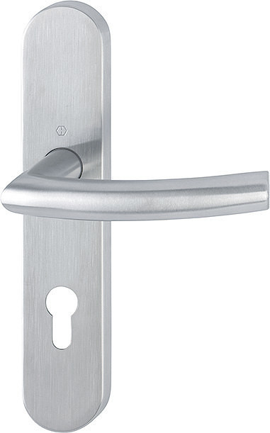 Garnitur / F69 Edelstahl matt / 9 mm / Profilvollstift / Profilzylinder 72 mm / 40-65 mm / fest/drehbar Kugelarretierung mit Rückholfeder / HOPPE-Logo / Gewindeschraube