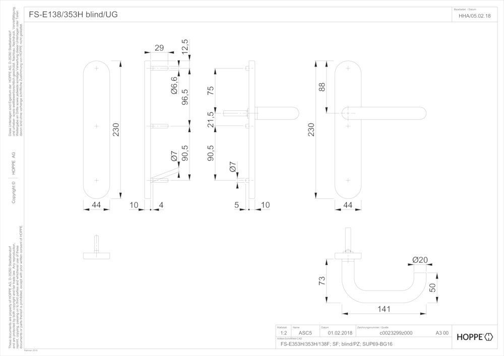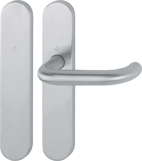 Feuerschutz-Langschild-GarniturStandflügelgarnitur / F69 Edelstahl matt / 9 mm / 42 mm vorst. / Vierkantstift mit efha-Einfräsung / A=blind I=ungelocht / 40-65 mm / mit Montagemodul, lose / HOPPE-Logo / Gewindeschraube