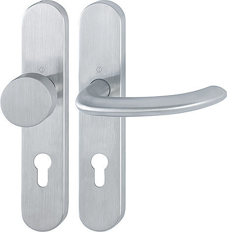 Garnitur / F69 Edelstahl matt / 9 mm / FDW-Profilvollstift / Profilzylinder 72 mm / 40-65 mm / außen=fest, innen=fest/drehbar Kugelarretierung mit Rückholfeder / HOPPE-Logo