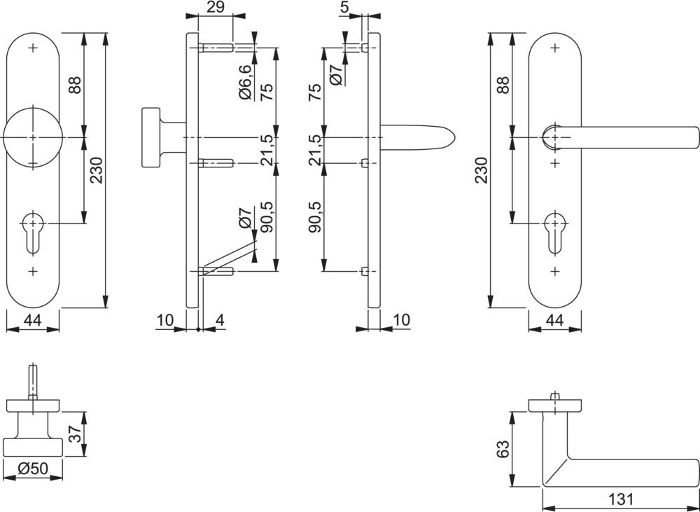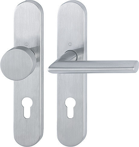 Garnitur / F69 Edelstahl matt / 9 mm / FDW-Profilvollstift / Profilzylinder 72 mm / 40-65 mm / außen=fest, innen=fest/drehbar Kugelarretierung mit Rückholfeder / HOPPE-Logo