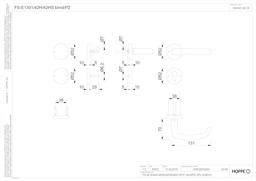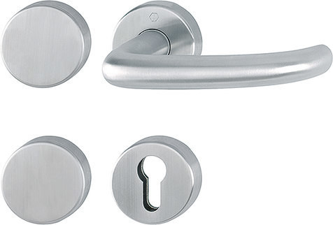Feuerschutz-Rosetten-GarniturStandflügelgarnitur / F69 Edelstahl matt / 9 mm / 42 mm vorst. / Vierkantstift mit efha-Einfräsung / A=blind I=Profilzylinder / 40-65 mm / mit Montagemodul, lose / HOPPE-Logo