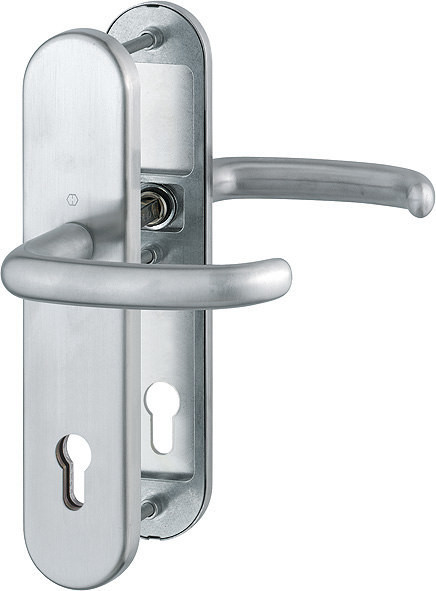 Garnitur / ES1 / F69 Edelstahl matt / 9 mm / Antipanik-Vierkantstift / Profilzylinder 92 mm / 67-72 mm / HOPPE-Logo